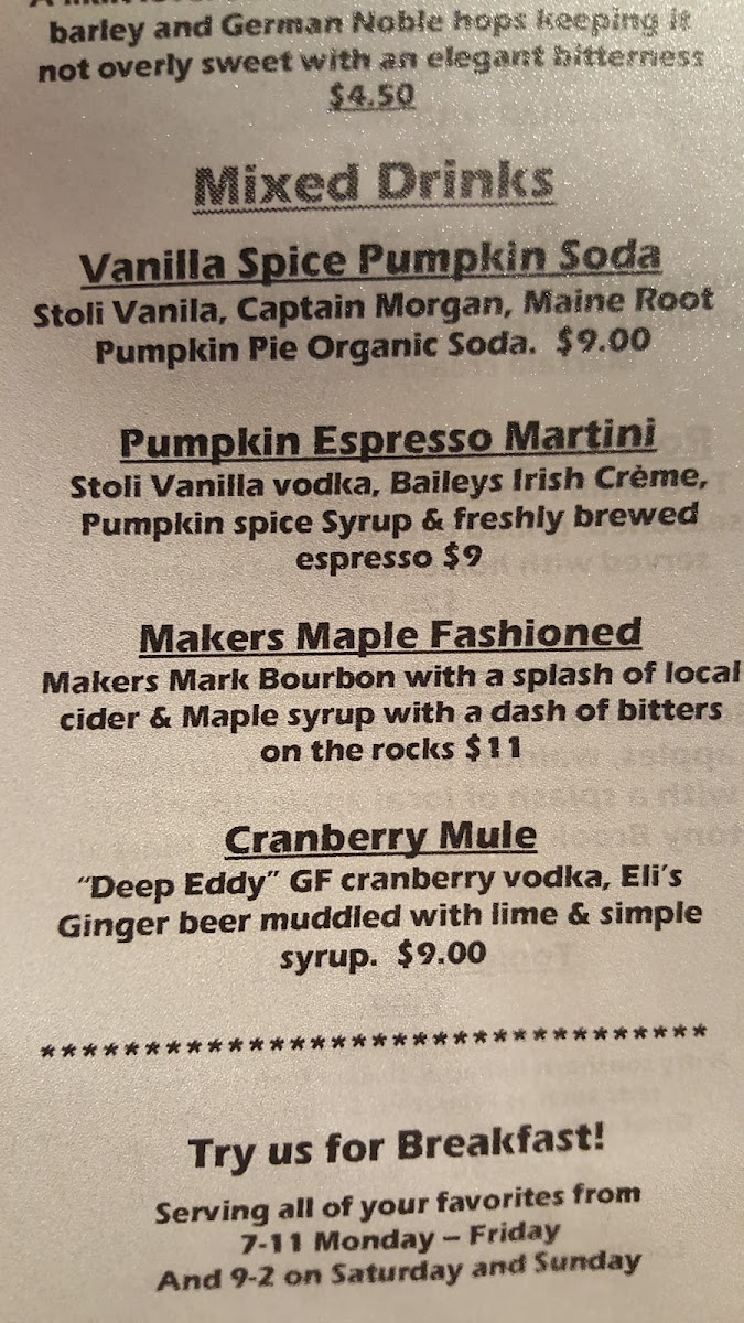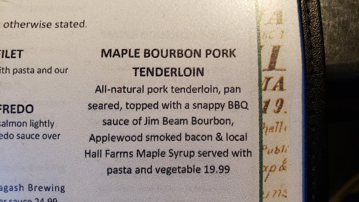 All-natural pork tenderloin, pan seared, topped with a snappy Jim Beam Bourbon Maple BBQ sauce & Applewood smoked bacon served with pasta and vegetable (Thanks Hall Farms Maple Products, E. Dixfield, ME)
